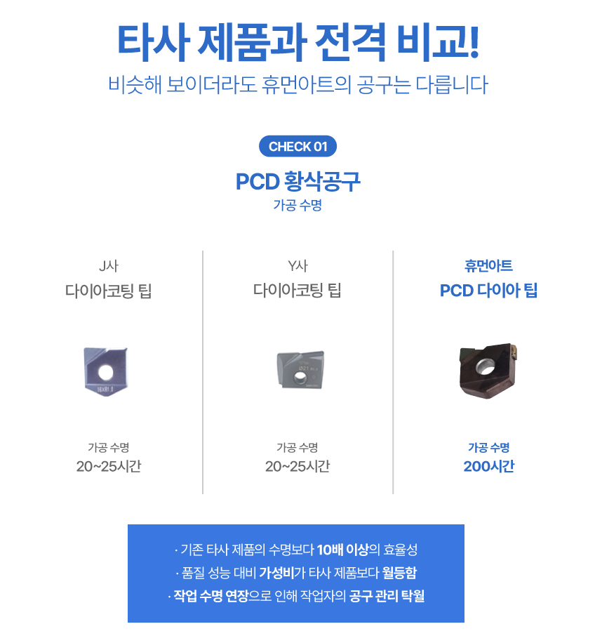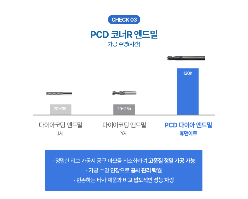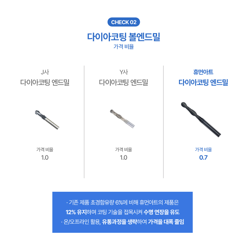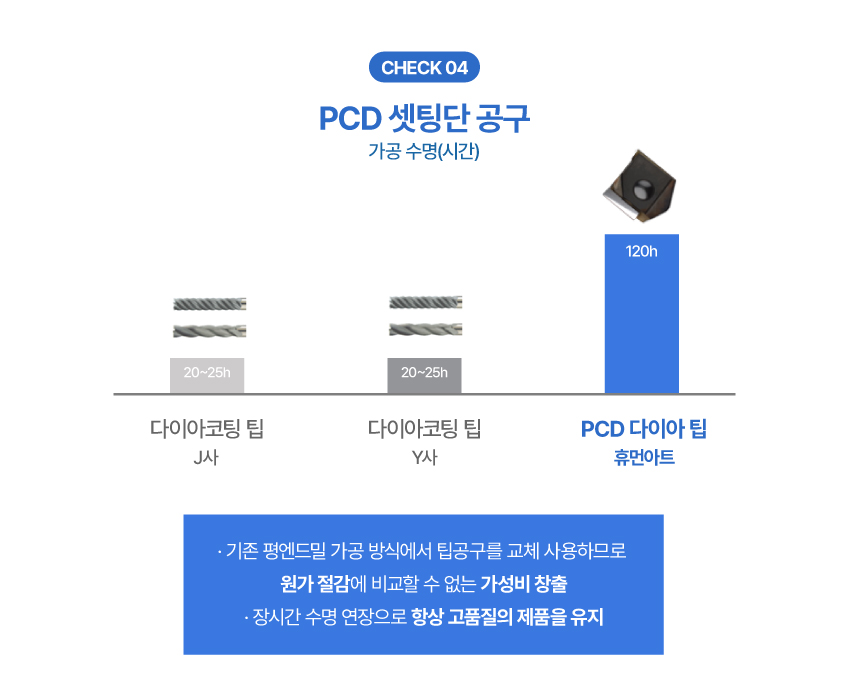 흑연 가공용 다이아몬드 코팅 엔드밀을 자체 개발하여 코팅의 두께가 1.4um으로 공구의 수명이 기존 공구와 비교하여 30% 향상되고, PCD다이몬드원석을 가공하여 초경엔드밀 바디에 붙여서 만들어진 다이아원석공구는 타사 다이아 코팅 공구에 비해 최소 10배 이상의 공구 수명으로 장시간 가공에 유리하여 경제적으로 큰 이점을 갖는다.